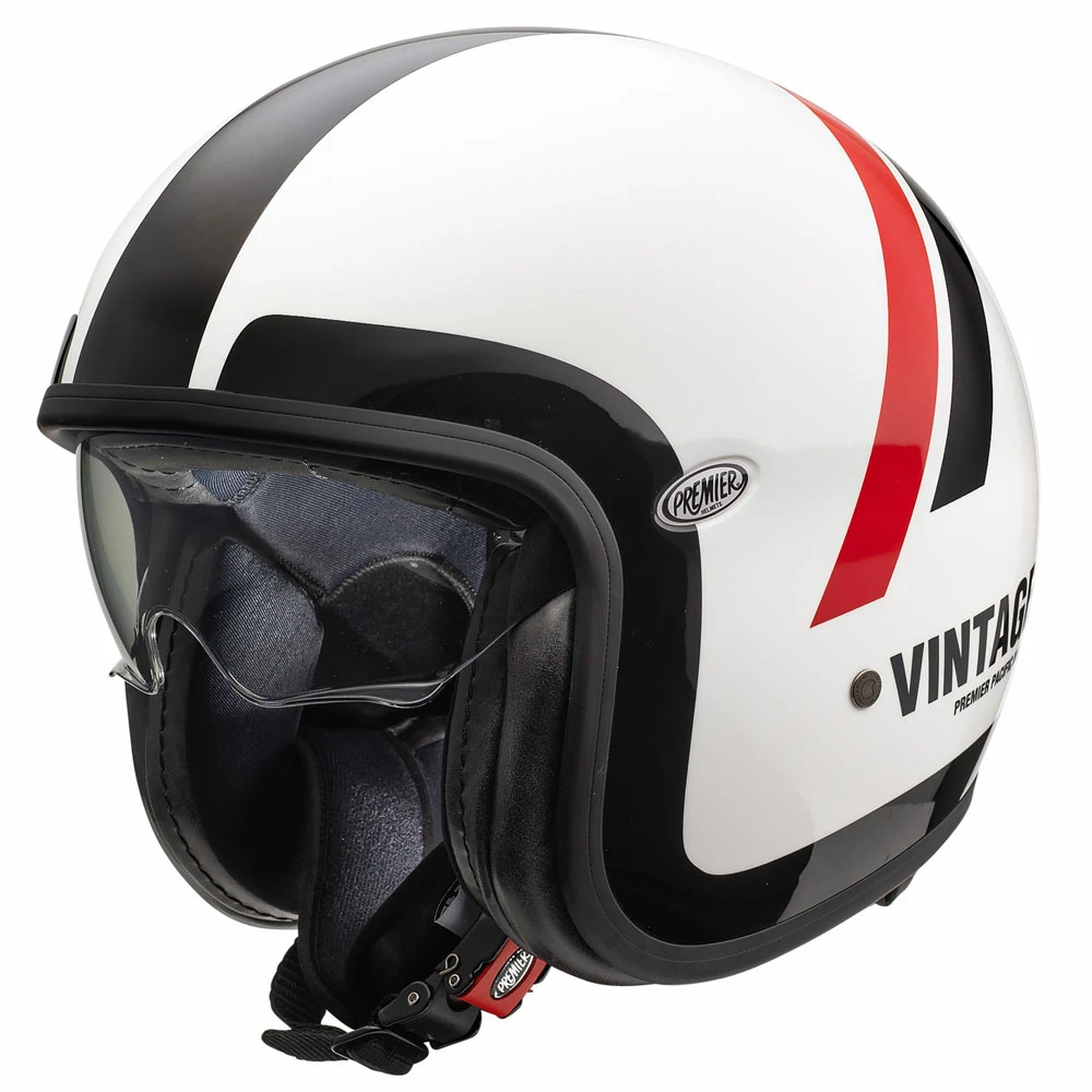 The desires of its customers have always been very important for Premier and for this reason theyβve included in the collection the Vintage model, an open face helmet that answers to the latest fashion and style requirements of the market. The Vintage is dedicated to those who want a fashion and cool city helmet, characterised by nice classic graphics, without forgetting about the safety requirements that, especially in the city centres where, based on recent statistics, the 67% of the motorbike crashes happens, are the most important characteristic of a protective helmet. In the 2014 Premier collection, there are new attractive graphics and Vintage is available in two versions :Vintage and Vintage Classic. The carbon version stands out in the Vintage version. The Vintage Carbon shell is made of carbon and itβs covered by transparent foil so you can see the carbon sheet. In the Carbon STAR BM and the CARBON KEWLAR model, the carbon shell shines out with aramidic fiber, it’s adorned with a graphic and matt transparent cover. In all the other versions Vintage is in DCA, which is a tri-composite mix (dyneema, carbon and aramidic fibres). This is the same fibre mix that Premier uses on all its helmets and it comes from the long experience that this Italian company has developed through years of study and by applying these fibres into the production of the helmets. The Classic version has three buttons on the front part of the helmet on which itβs possible to attach the classic peak (which is supplied with the helmet) or a long visor (sold as an accessory in a clear and dark version). In all models the internal shell is in EPS, moulded with differentiate density in order to offer the best shock absorption in case of impact. The Jet Vintage has an easy-to-use internal sun visor which is placed between the internal and external shell. The inner liners are made with anti-allergic Sanitized fabric, and theyβre completely removable and washable, an exception of the classic vintage in which only the cheek pads are removable, and the borders are in fake leather. The chinstrap has a micrometric buckle. As with all the other Premier helmets, the Vintage is homologated under the ECE 22-05 law. NΒ° shell: 1. Material: tri-composite fibers and resin. Weight: 990 gr +