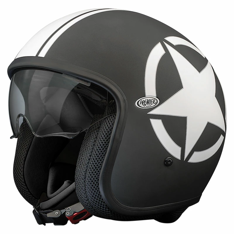 The desires of its customers have always been very important for Premier and for this reason theyβve included in the collection the Vintage model, an open face helmet that answers to the latest fashion and style requirements of the market. The Vintage is dedicated to those who want a fashion and cool city helmet, characterised by nice classic graphics, without forgetting about the safety requirements that, especially in the city centres where, based on recent statistics, the 67% of the motorbike crashes happens, are the most important characteristic of a protective helmet. In the 2014 Premier collection, there are new attractive graphics and Vintage is available in two versions :Vintage and Vintage Classic. The carbon version stands out in the Vintage version. The Vintage Carbon shell is made of carbon and itβs covered by transparent foil so you can see the carbon sheet. In the Carbon STAR BM and the CARBON KEWLAR model, the carbon shell shines out with aramidic fiber, it’s adorned with a graphic and matt transparent cover. In all the other versions Vintage is in DCA, which is a tri-composite mix (dyneema, carbon and aramidic fibres). This is the same fibre mix that Premier uses on all its helmets and it comes from the long experience that this Italian company has developed through years of study and by applying these fibres into the production of the helmets. The Classic version has three buttons on the front part of the helmet on which itβs possible to attach the classic peak (which is supplied with the helmet) or a long visor (sold as an accessory in a clear and dark version). In all models the internal shell is in EPS, moulded with differentiate density in order to offer the best shock absorption in case of impact. The Jet Vintage has an easy-to-use internal sun visor which is placed between the internal and external shell. The inner liners are made with anti-allergic Sanitized fabric, and theyβre completely removable and washable, an exception of the classic vintage in which only the cheek pads are removable, and the borders are in fake leather. The chinstrap has a micrometric quick release buckle. As with all the other Premier helmets, the Vintage is homologated under the ECE 22-05 law. NΒ° shell: 1. Material: tri-composite fibers and resin. Weight: 990 gr +