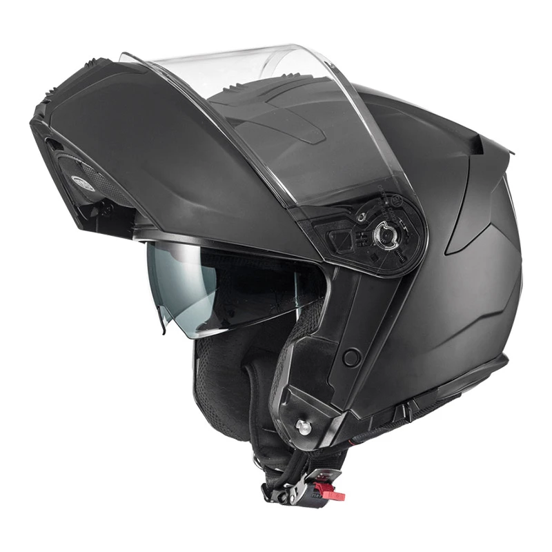 In addition, in addition to the scratch-resistant polycarbonate visor, it is equipped with a dark concealed inner visor that allows optimal driving in all weather and light conditions, and which is operated by a convenient lever on the left side of the helmet.